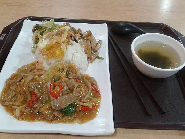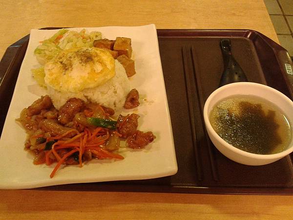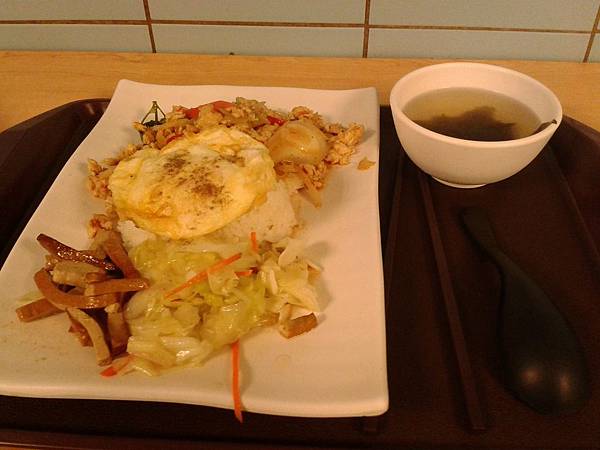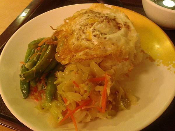 飯菜內有荷包蛋,還是蛋黃沒熟的那種,而且上面有灑一些胡椒吃起來非常香,不過其他配菜就冷冷的。