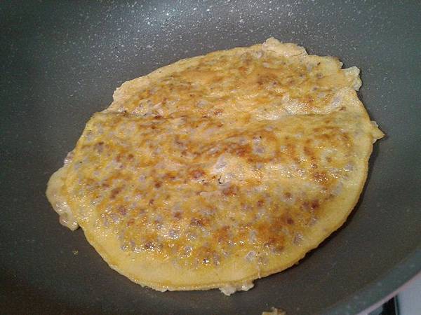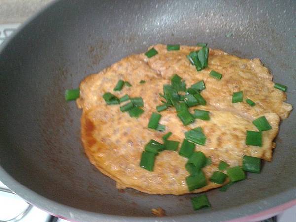 這道菜不一定要煎成漂亮的圓形,因為有碎肉的關係,在煎蛋的時候其實有點難翻,如果不小心變成披薩樣子也是可以上桌的,並不影響味道。