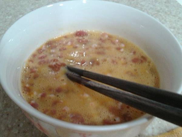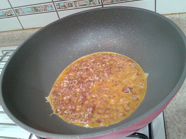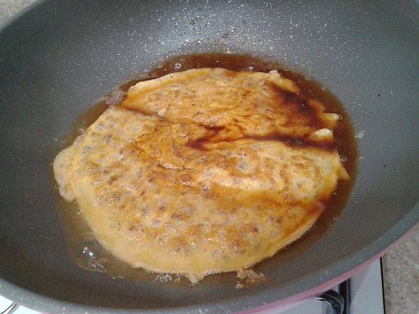 接著就下鍋開始煎,蛋要煎得漂亮油一定要放得夠多,為了保持漂亮的圓形,下鍋後可以稍微搖動一下讓蛋汁跟碎肉均勻分布。