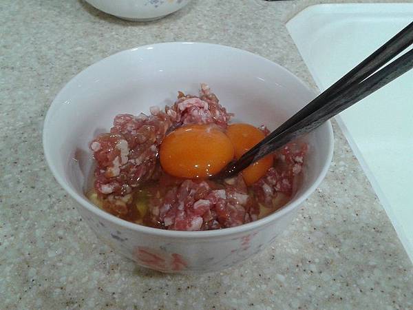 將豬絞肉跟蛋打散,這時候可以加入一點點調味料,像我個人喜歡大漠風味通常會灑上一片孜然,不過爺爺正統的做法是都不用加,建議第一次做的時候吃原味看看。