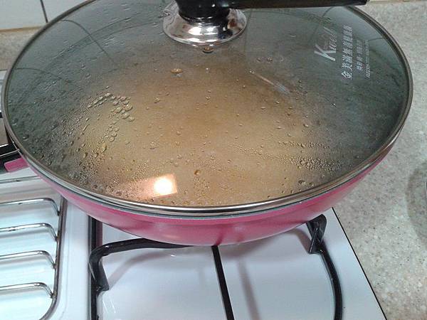 然後關小火,開始倒水進去再加上一湯匙的醬油,只要稍微淹過蛋本身一點點就可以了。