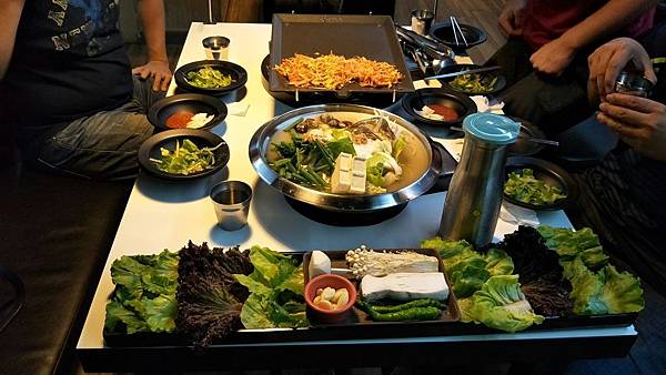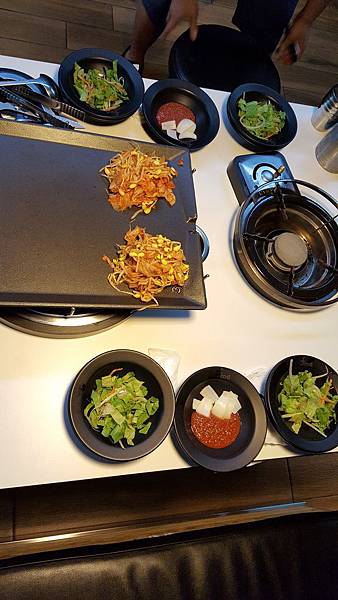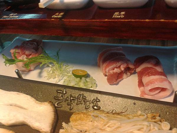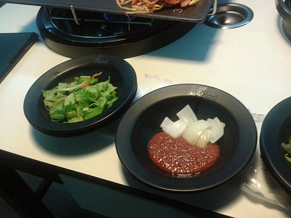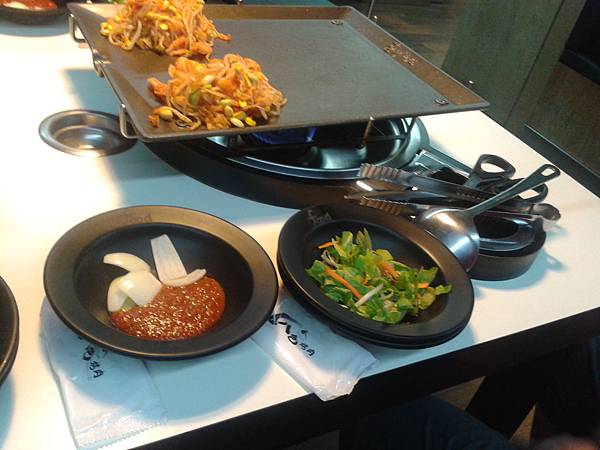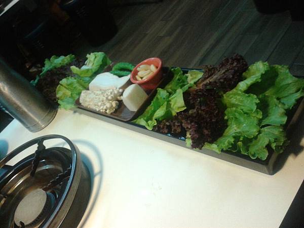 桌子旁邊擺了一堆蔬菜、香料,另外有塊方方的蘿蔔,千萬別像我急著想把它吃掉,那個是用來清烤盤用的。(唉,我來吃八色烤肉,好幾次瀕臨跌股邊緣)