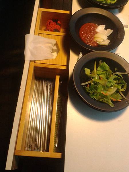 不過後來才被人糾正,綠色葉子的那盤真的就只是餐前的生菜沙拉,可以直接吃。洋蔥+醬的那盤我基本覺得不必要,因為八種顏色的烤肉本身就有獨特的味道,再沾醬不太OK。