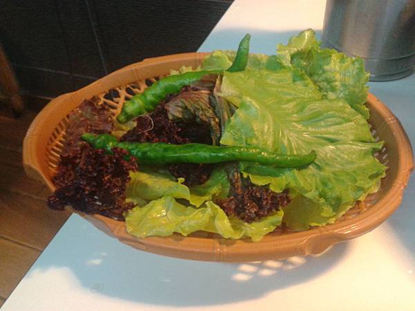 包肉生菜的部分是可以一直續的,那兩條像是辣椒的東西,後來問了一下是[糯米椒],吃起來不會辣,配著烤肉吃別有一股清新感覺。