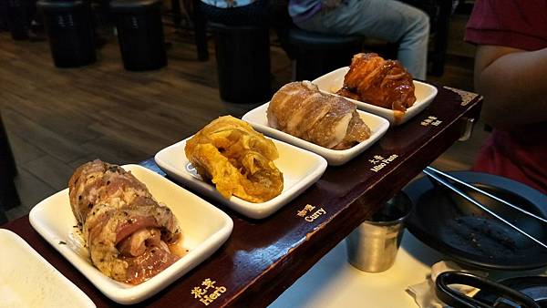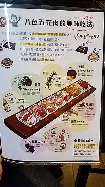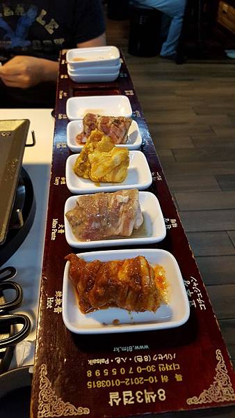 八種顏色的烤肉分別為[人參、紅酒、松葉、蒜味、花草、咖哩、大醬、韓式辣醬],味道是依序越來越重,服務生都會特別提醒要從左吃到右。
