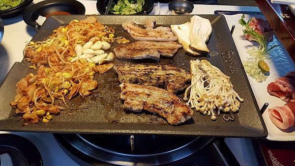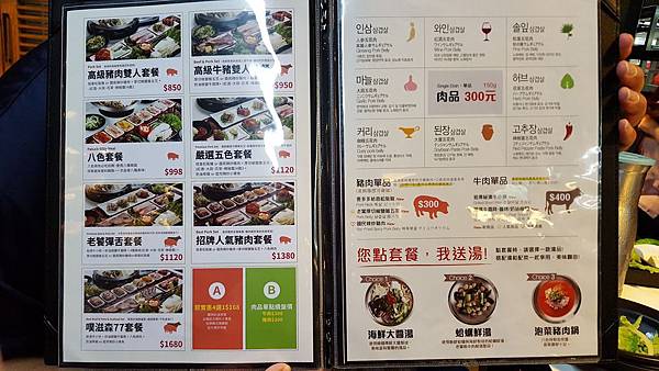 結果今天點的是招牌人氣豬肉套餐 NT$1380 (松阪豬豬五花、八色烤肉、海鮮大醬湯)。