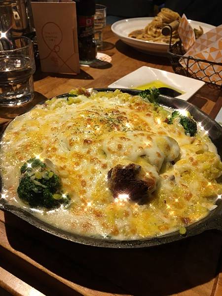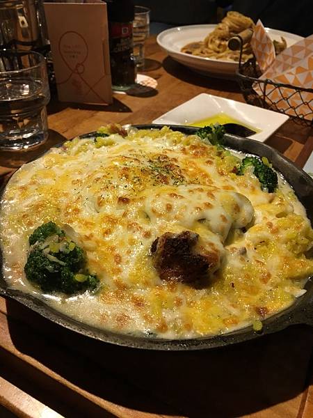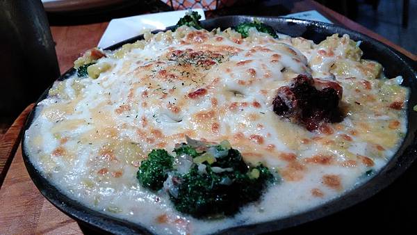 主餐-藍帶雞排奶油烤飯,第一印象是好燙、好香、肉好厚,盤子看起來淺淺的但是量真的不少ㄟ,雞排因為蓋著濃厚的起司,每一口都相當濃郁,咬久了還有點說不上來的香氣。飯則有點像咖哩的辛香味,不確定是不是咖哩調味,不過跟起司很搭。